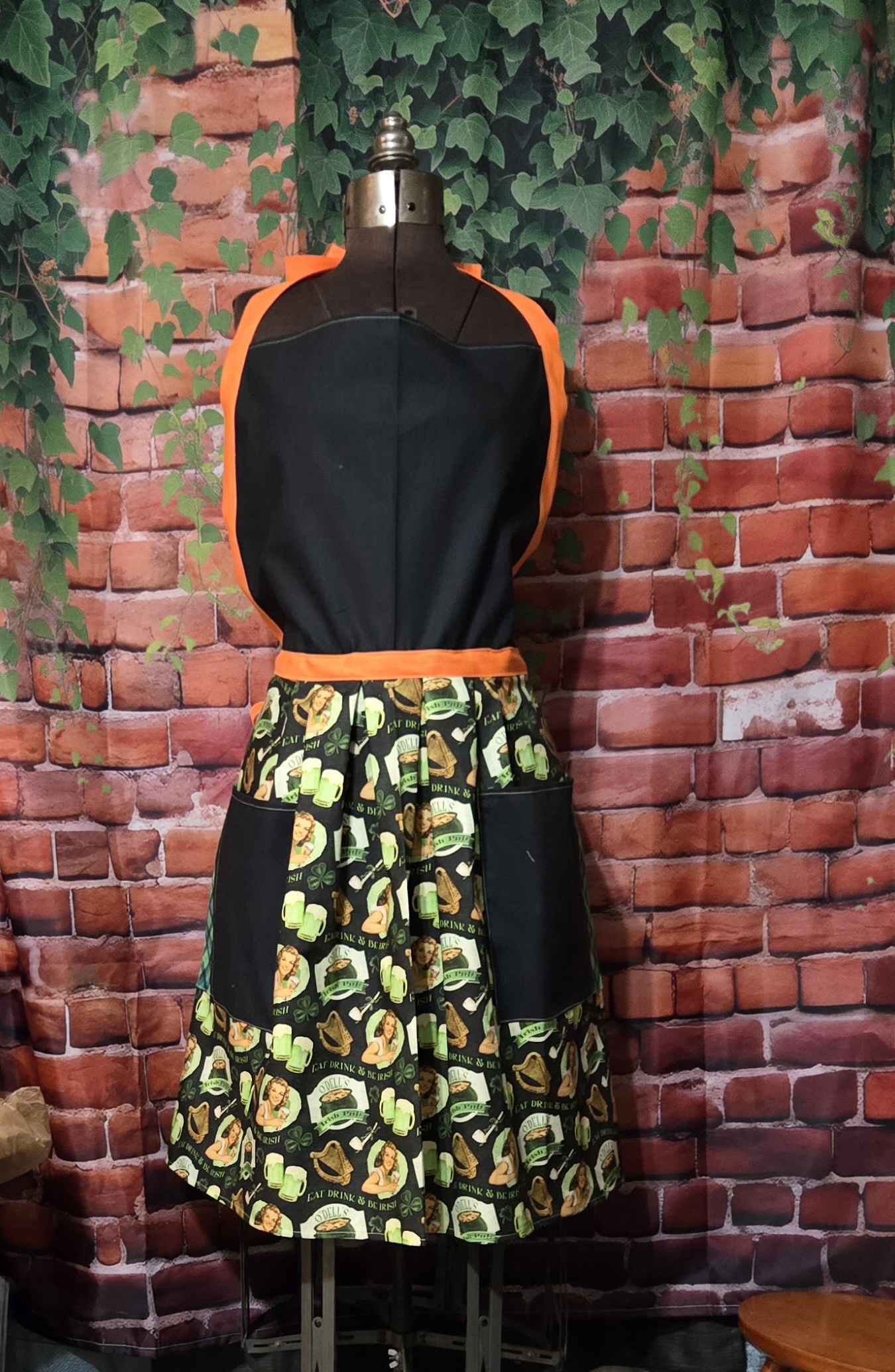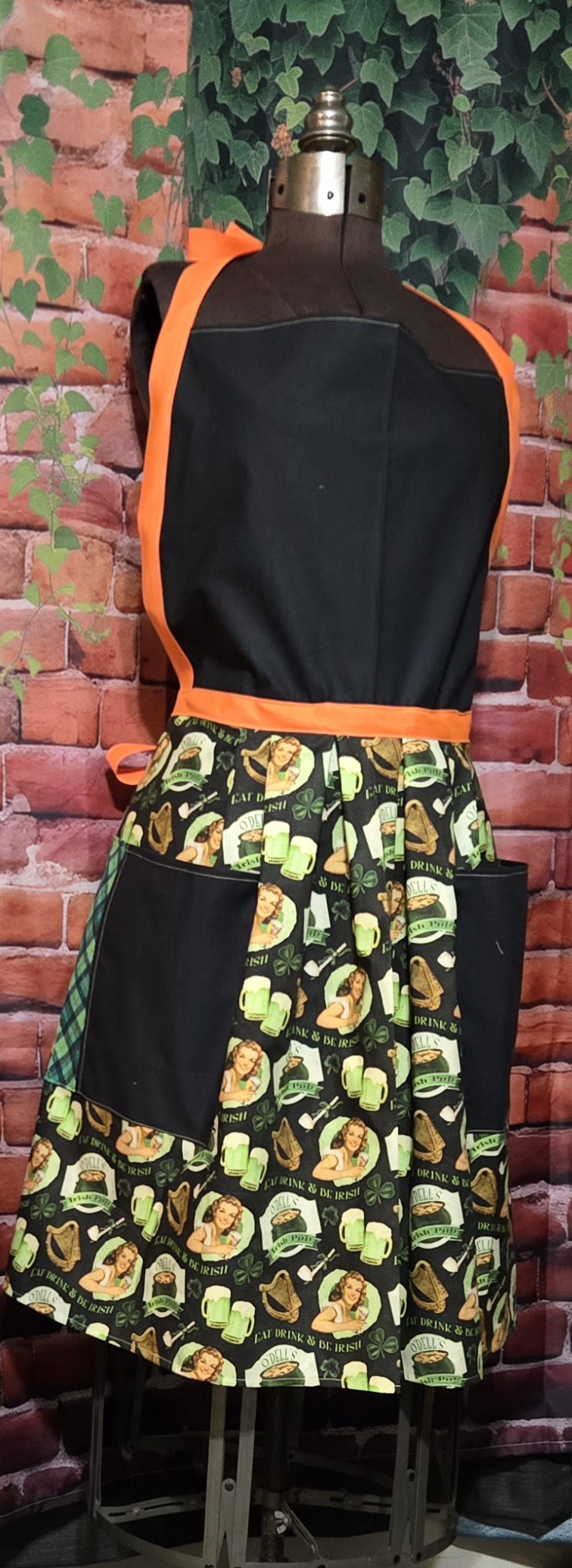 Kitchen Apron Full: St. Patrick’s Day; Irish Pub Black Top, Print skirt with 2 pockets